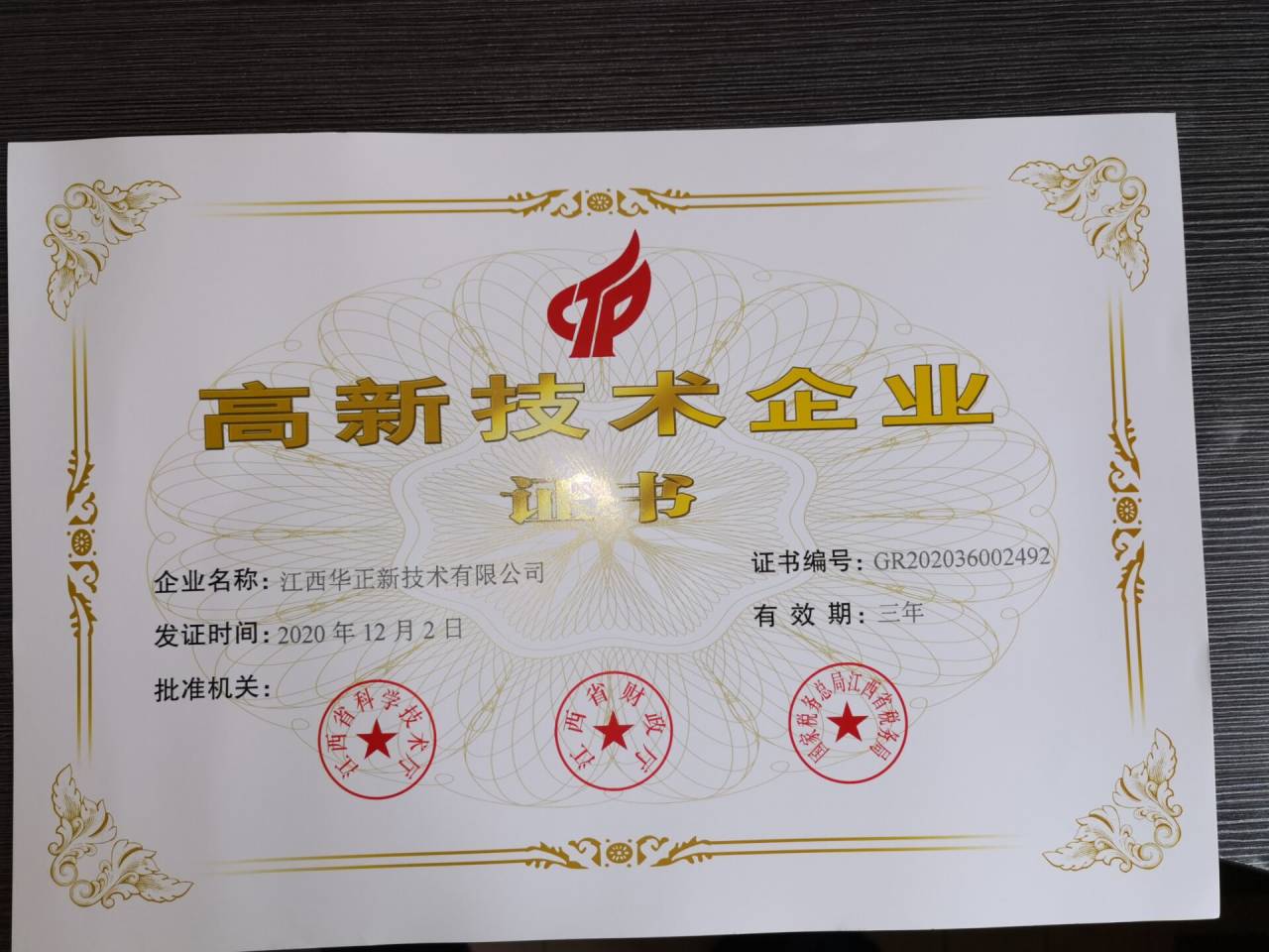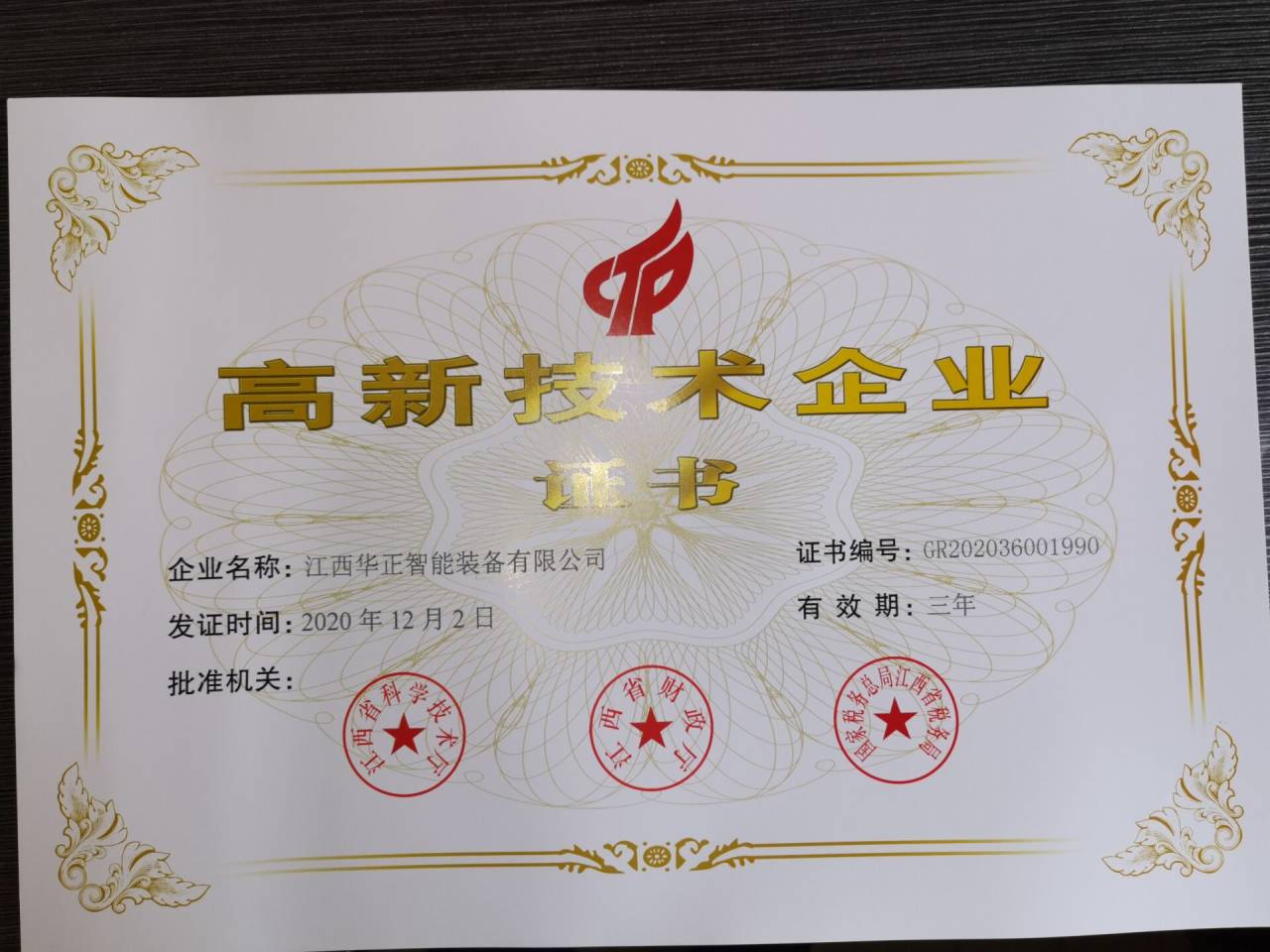 近日,公司已收到了由江西省科學技術廳、江西省財政廳、國家稅務總局江西省稅務局聯(lián)合頒發(fā)的“高新技術企業(yè)證書”。由此,我公司正式邁入國家高新技術企業(yè)行列。
